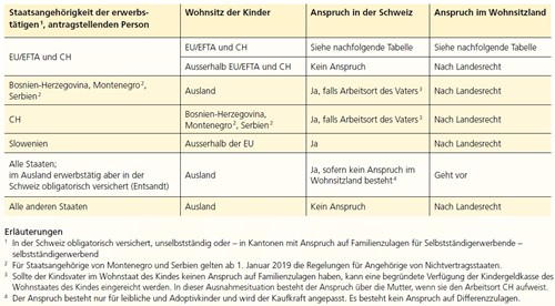 Eine anspruchsberechtigte Person geht im Wohnsitzland der Kinder einer Erwerbstätigkeit nach oder erfüllt dort einen der Erwerbstätigkeit gleichgestellten Tatbestand, indem sie beispielsweise Leistungen aufgrund Arbeitslosigkeit, Krankheit, Unfall, Invalidität oder Elternzeit bezieht. Die Zulagen müssen somit im Wohnsitzland der Kinder bezogen werden. Grundlage dafür bildet das Freizügigkeitsabkommen Schweiz-EU.